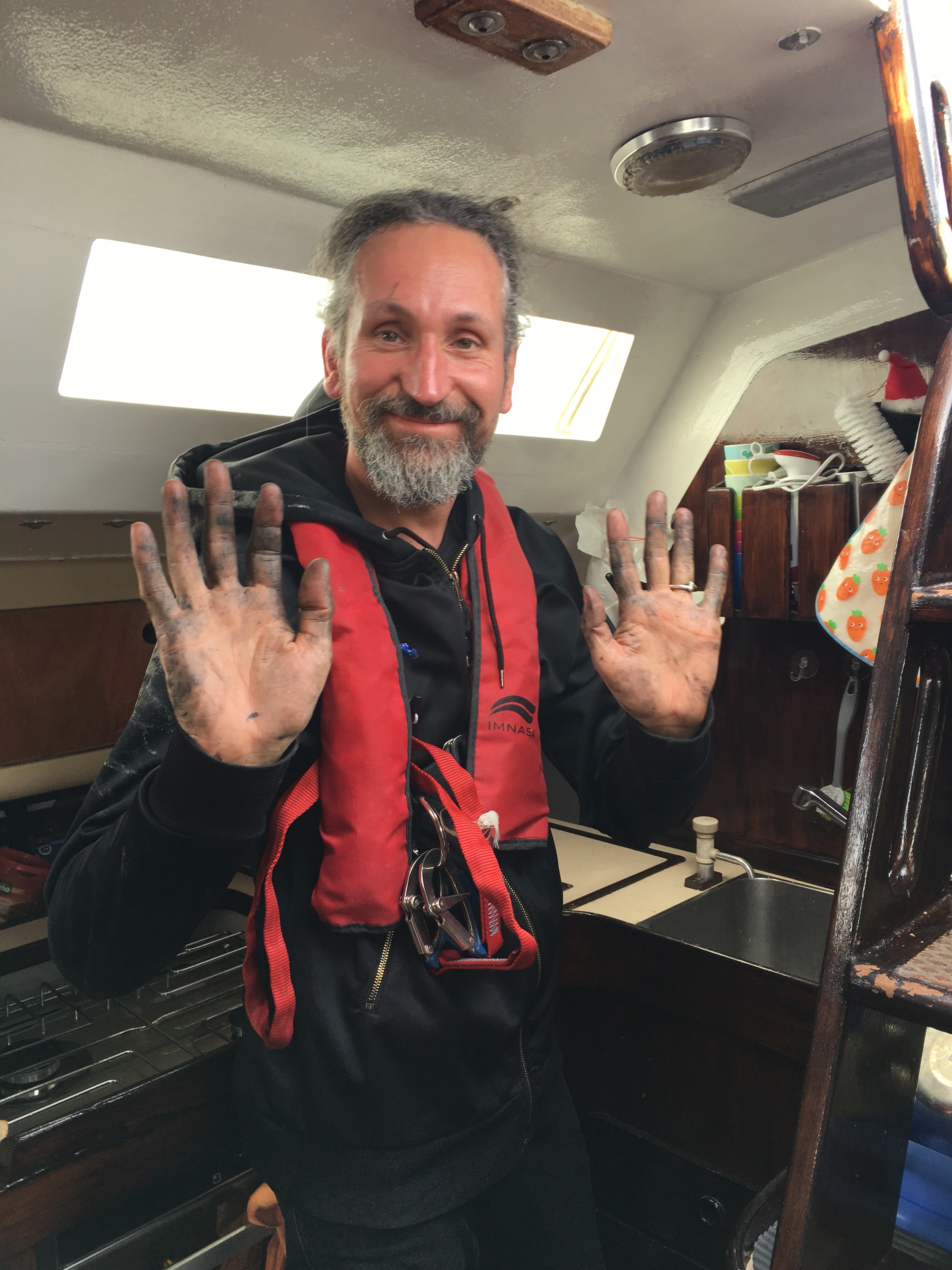 Markus was on it straight away and it took around 4 hours before it was all fixed, but not with out leaving a big mess on the boat! Oil and grease all over the cockpit and our bed in the af- cabin!
