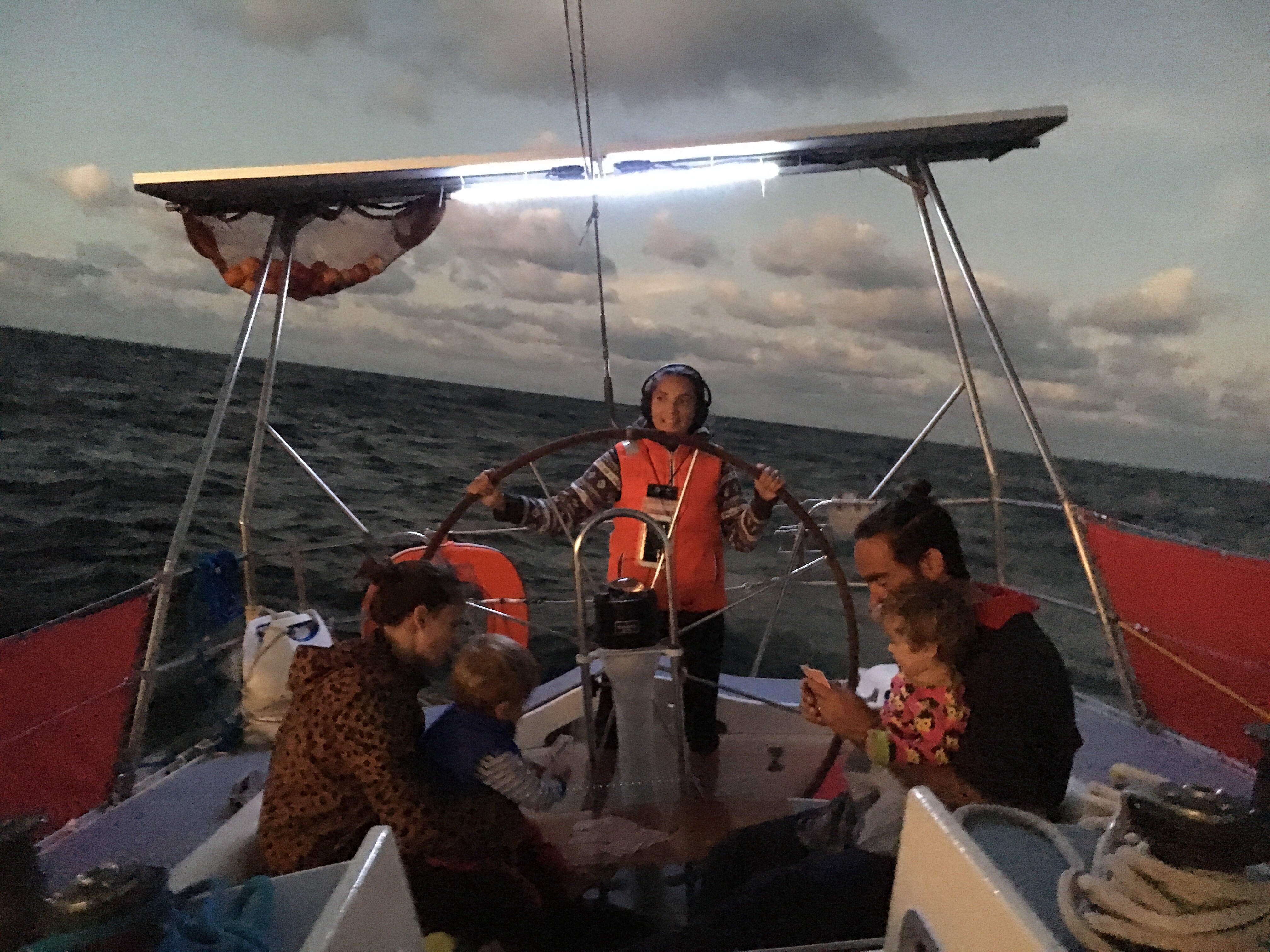 O well, the first day was hard! A lot of wind that made it a challenge to steer, Sara trying to be super strong even doh seasick and I having a hard time with both kids and having tooth pain and taking antibiotics. Kai feeling bad and puking ones in a while, but nothing that a chocolate sandwich couldn’t fix!